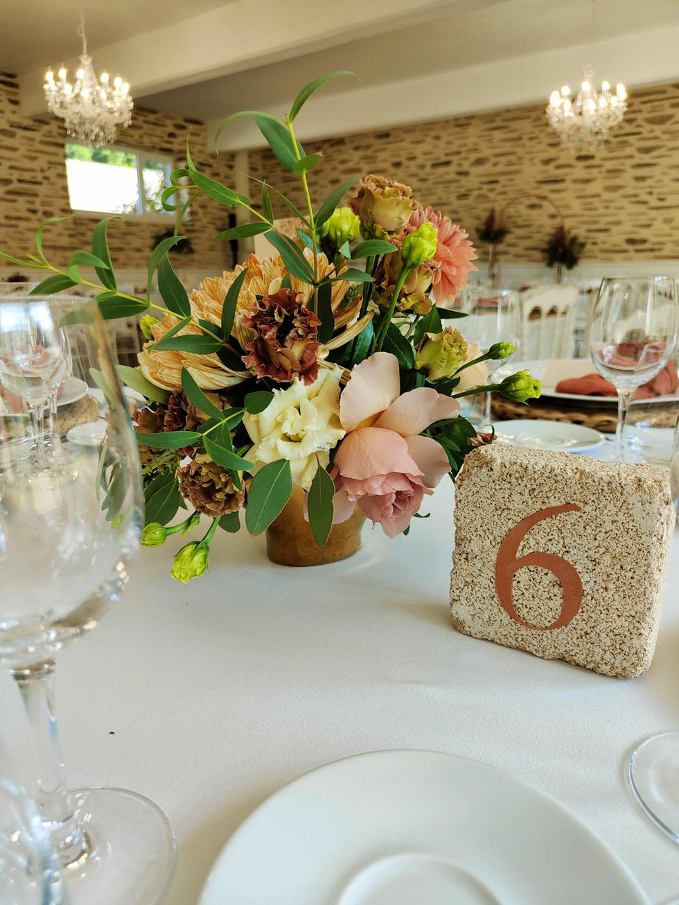 Pour mettre en avant ce côté chaleureux nous avons travaillé les fleurs de pampas, le bois, du tissu texturé, de la pierre.